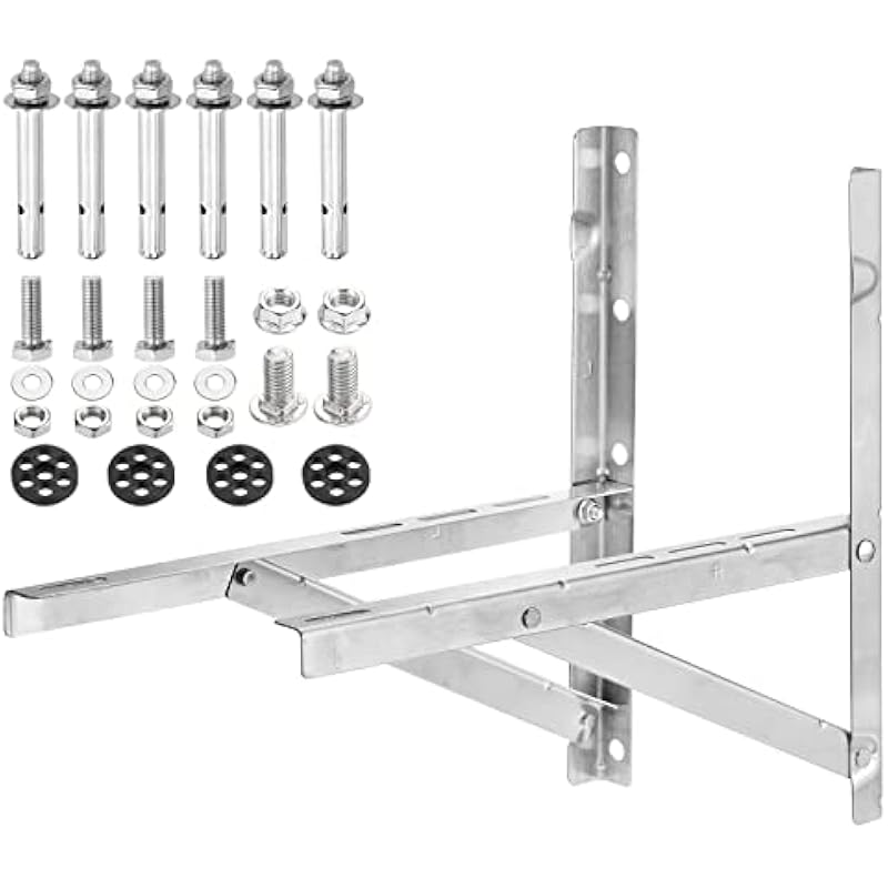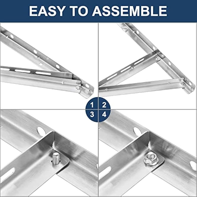 - Easy to Install: Easy to assemble, the air conditioner bracket is connected with rivets, mount it securely to the wall with the stainless steel expansion screws, and then place the equipment on and fix it with the screws provided.