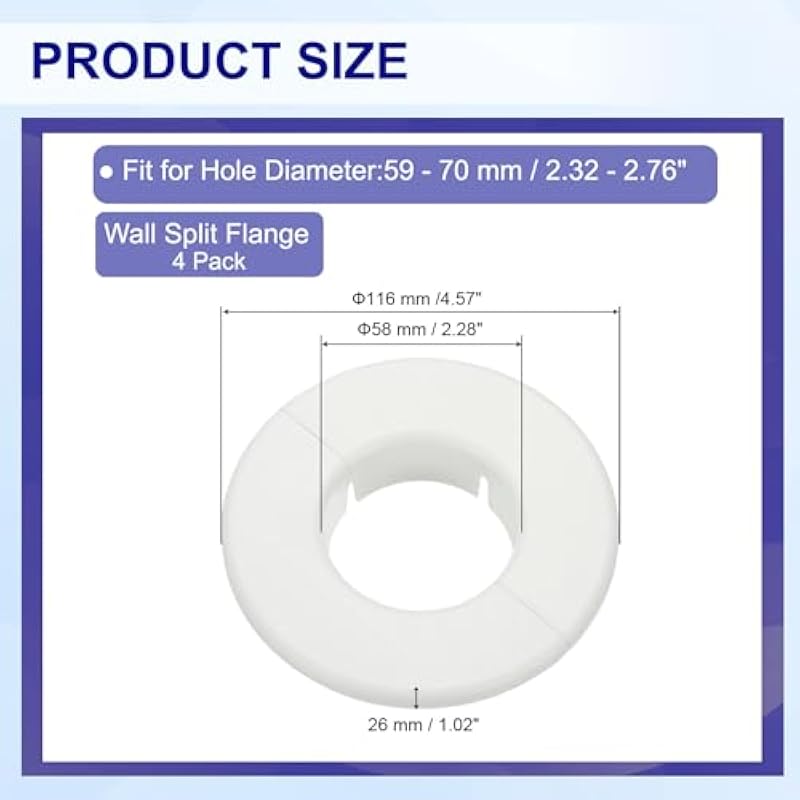 - Color: White; Material: PP; Diameter: 116 x 58 mm / 4.57 x 2.28 inch; Height: 26 mm / 1.02 inch; Fit for Hole Diameter: 59 – 70 mm / 2.32 – 2.76 inch; Packing List: 4 Pcs x Wall Split Flange
