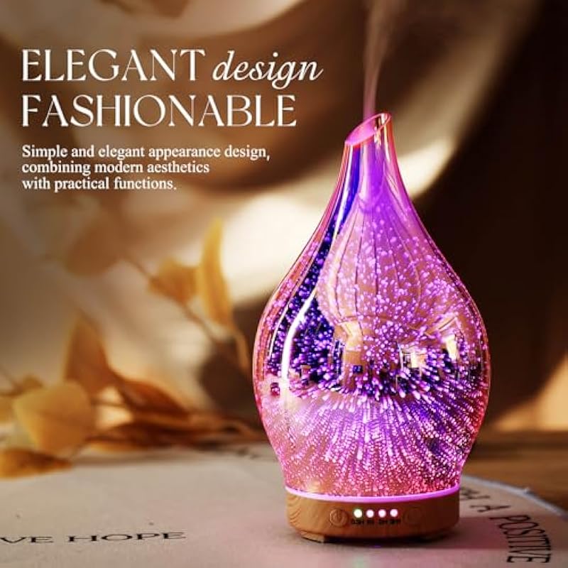 - UNIQUE ART DECORATIVE DESIGN – Our 150ml glass essential oil diffuser has a firework 3D effect glass cover and wood grain decorative base. It is very suitable for your bedroom, living room, children’s room, study room, office, and yoga room.