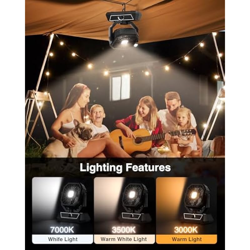 Camping Fan Rechargeable, Battery Powered Fan with Lights, Outdoor Beach Tent Fans, 4 Speed, Adjustable Brightness for Picnic, Barbecue, Fishing, Office, Home
