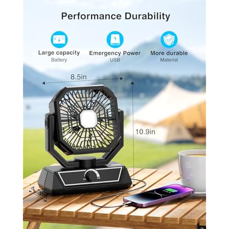 Portable Camping Fan with 20000mAh Rechargeable Battery, USB-C Battery Powered Fan for Indoor Outdoor Use, Ultra Quiet Battery Operated fan for Travel, Tent, Beach, Picnic, BBQ, Desk, Home