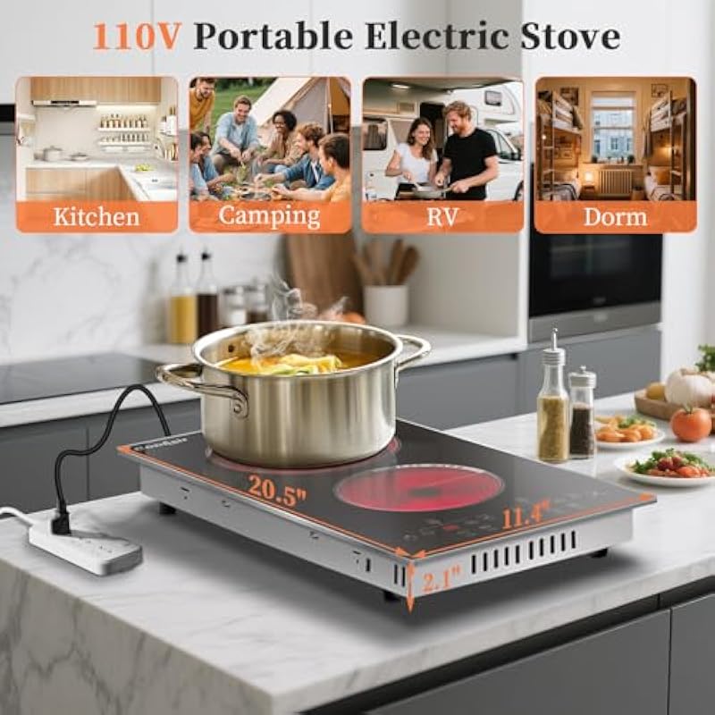 - 【110v Electric Stovetop with Plug】The voltage of 2 burner electric cooktop is 110-120v, which is the standard voltage for North American families. The electric stove top is equipped with a plug, which can be directly connected to the socket for use without installation or wiring. It is very convenient to use. You only need to go through the various functions when you first meet it. Note: Ceramic cooktop does not always show red during heating, which is a normal phenomenon rather than a fault.