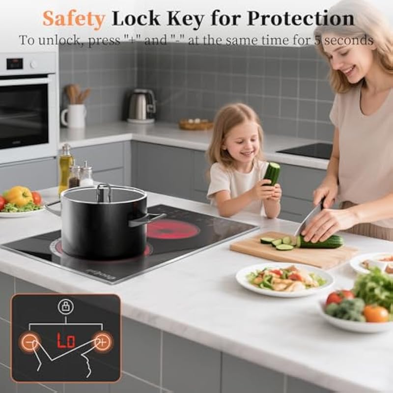 - 【Smart, Safe and Multi-function Electric Cooktop】Each burner has an independent control area with digital display and clear function icons. It is easy to operate it skillfully. The large burner has 1~9 adjustable heat levels, the small one keep warmer has two, “L” means low and “HI” is high. The electric stove has several safety protection functions, such as safety lock (“LO”), residual heat warning (“H”), over temperature protection, 0-99 minutes timer and pause function (shows “| |”).