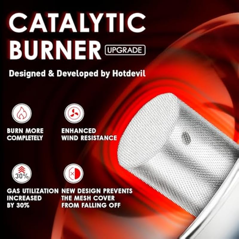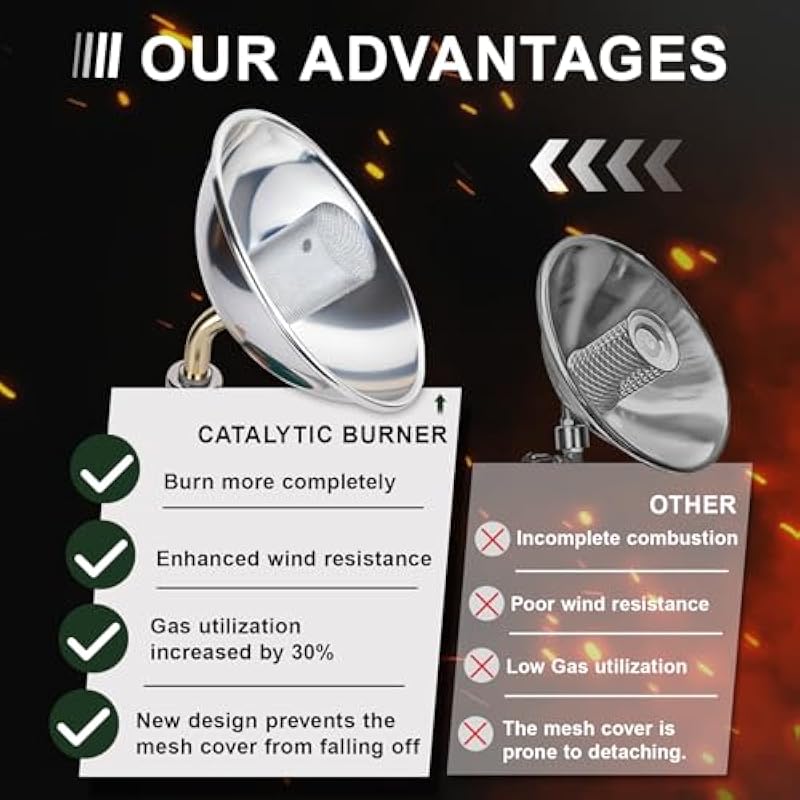 - Upgraded Catalytic Heater: Experience warmth in seconds with our powerful propane gas heater catalytic heating , capable of heating up to 200 square feet with an impressive 6200 BTU radiant heat output. The upgraded catalytic burner delivers radiant heating with more complete combustion and enhanced wind resistance, significantly boosting heating performance to ensure your comfort even in the harshest cold.