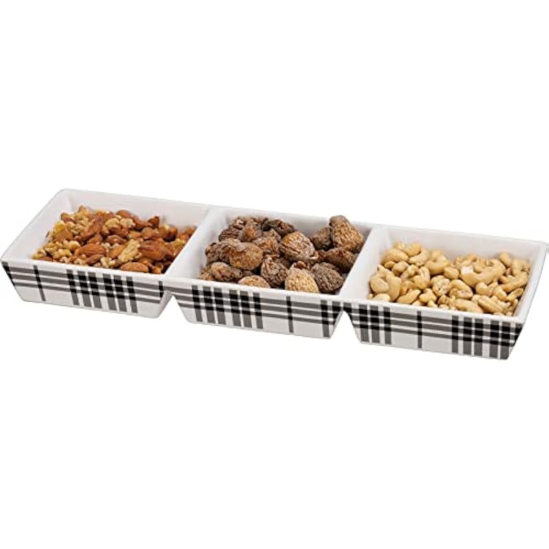 Primitives by Kathy Recangular Stoneware Tidbit Tray – Black & White Plaid Design (3 Sections) 15.25 Inch