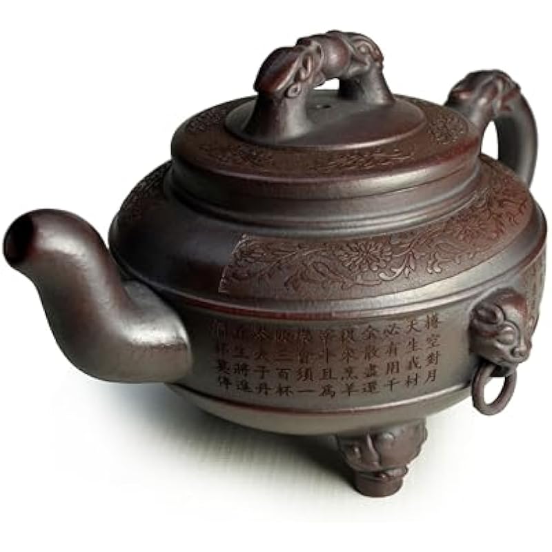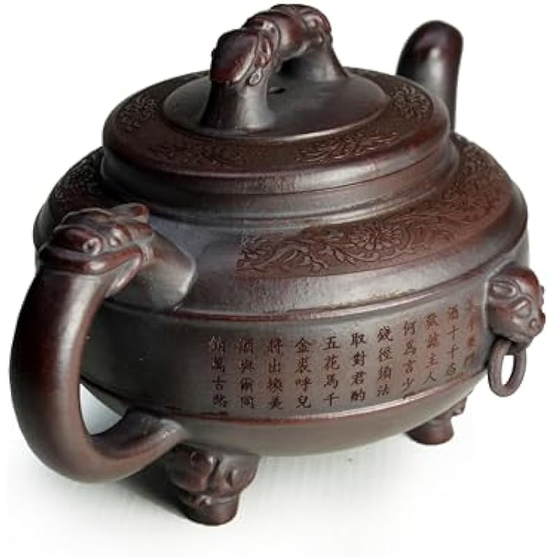 - 【Classic Dragon & Tripod Design】 Inspired by ancient Chinese tripod cauldrons, this teapot features engraved classical Chinese poetry and mythical beast motifs. The handle and knob are shaped like dragons, symbolizing prosperity and nobility, embodying rich Eastern cultural heritage.