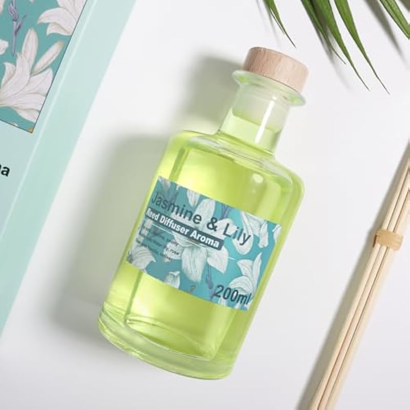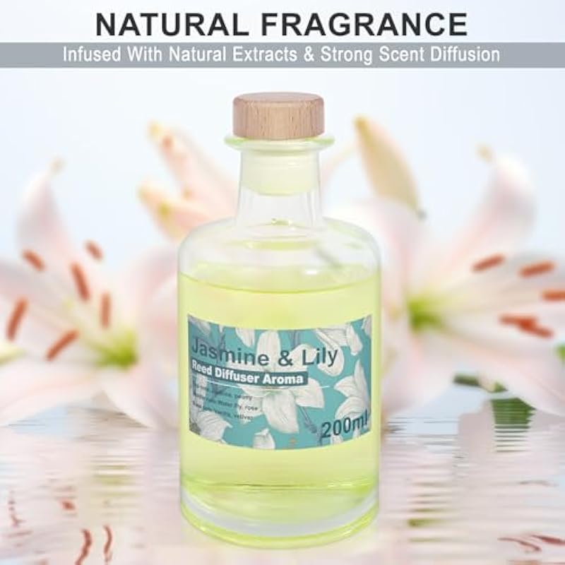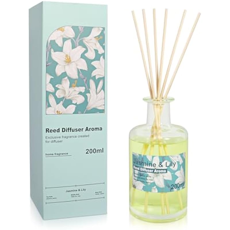 Reed Diffuser Set – 200ml Jamine & Lily Essential Oil Set Includes Rattan Sticks, 6.8fl oz Flower Aroma, Large Glass Bottle, Bathroom Air Freshener, Home Fragrance for Shelf Room Decor