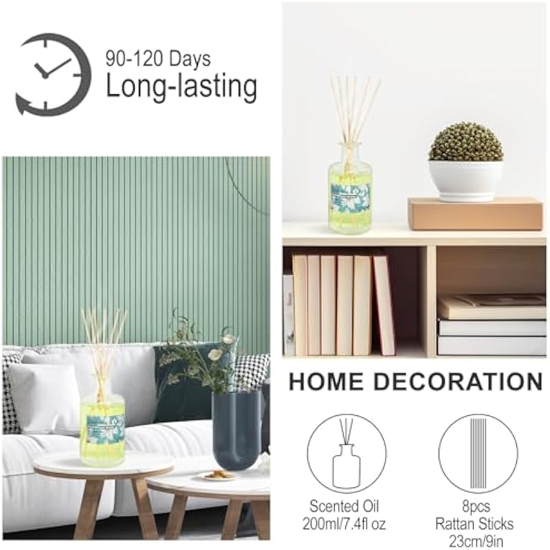 - [200ml/6.8 Fl Oz Large Bottle ] – This reed diffuser set features a large capacity of 200ml colored bottles and a continuous fragrance spreading time of 90-120 days. 5 sets of reed diffuser add floral and fruity aromas to meet your fragrance needs. In addition, 5 colored glass bottles also add a touch of natural color beauty to the design.