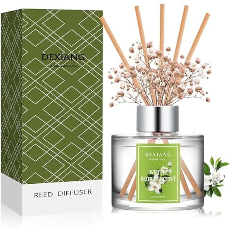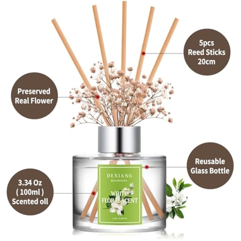 Reed Diffuser Set – 3.38oz (100ml) White Floral Scent Essential Oil Air Freshener with 6 Reed Sticks| Long-Lasting Aromatherapy for Home, Bathroom, Office Decor