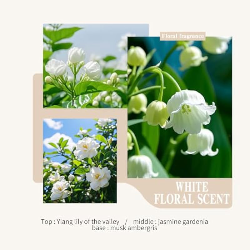 - White floral scent: The bright waterfall of Ylang Ylang spreads out like dew-kissed petals, accompanied by the creamy color of gardenia reminiscent of the silky smoothness of a silk scarf.