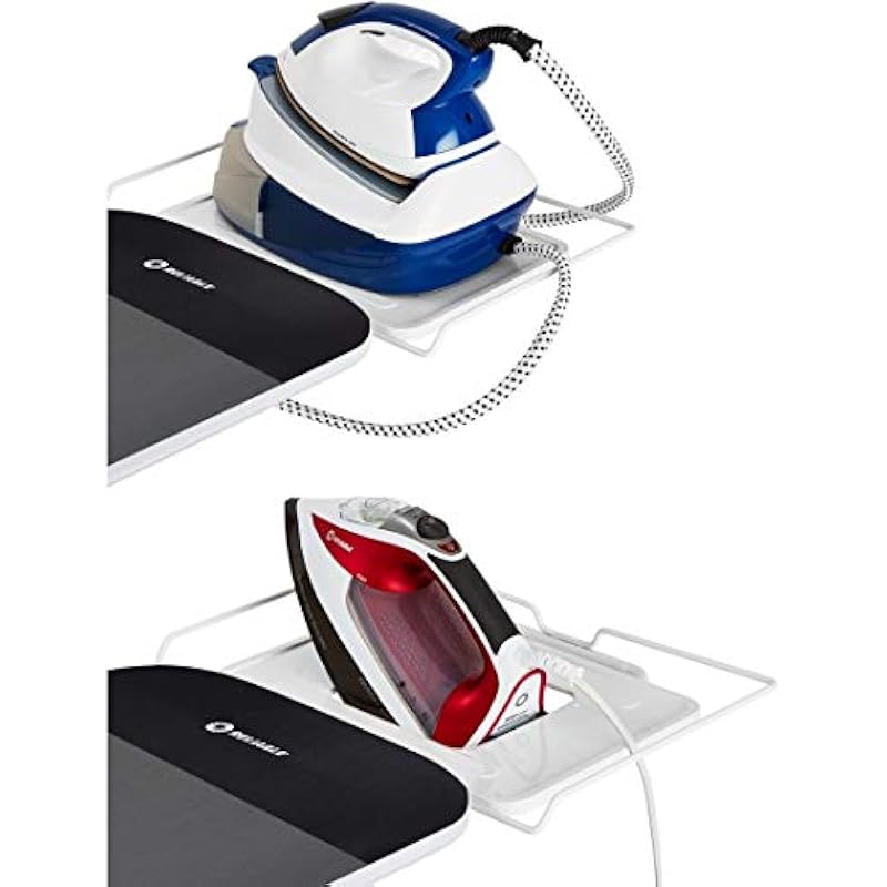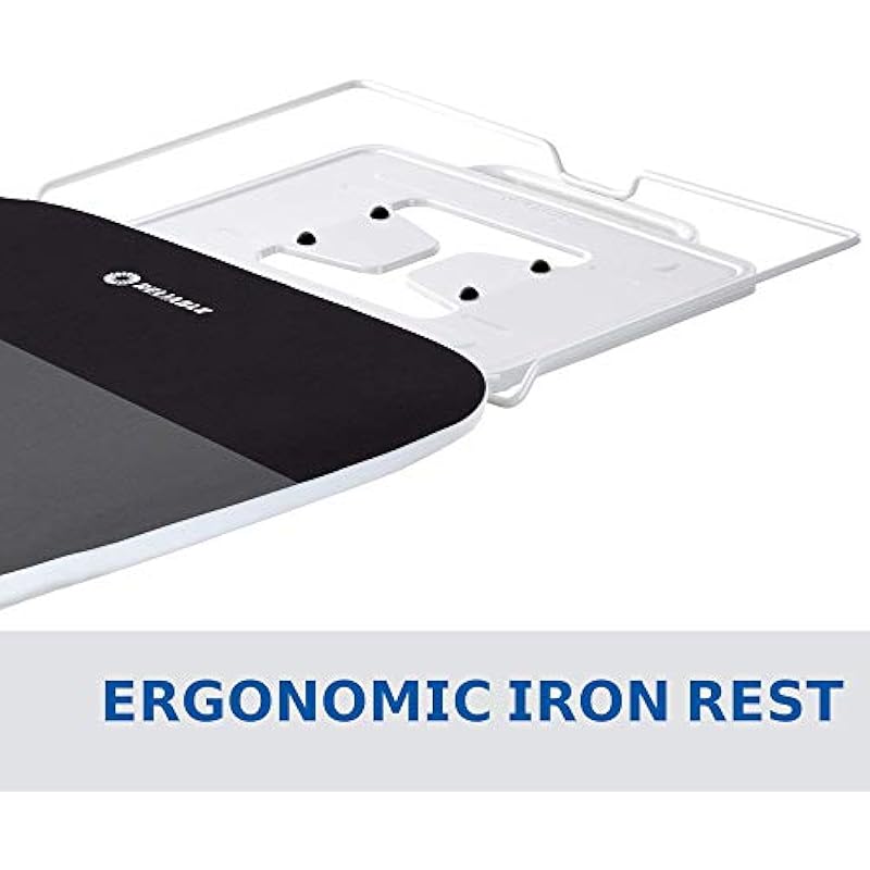 - Ergnomic Iron Rest- The ergonomic iron rest on this ironing board eliminates wrist strain and makes it easy to pick up and and put down your iron. The iron rest is strong enough to hold any iron station and convenient for any household iron.