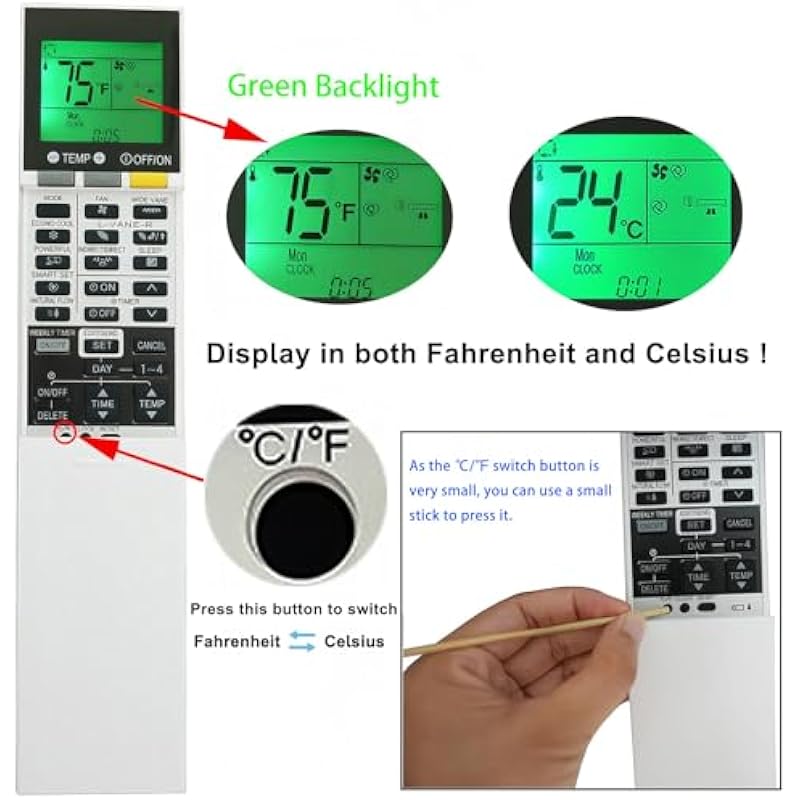 - Display in both Fahrenheit and Celsius ! (This remote defaults to Fahrenheit when turned on, you can also switch to Celsius if needed).