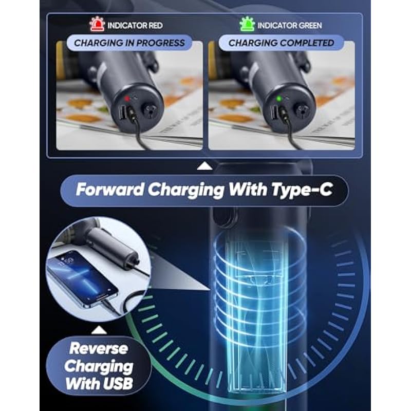 - 【Fast and Safe Charging Transmission】The portable cordless vacuum cleaner is powered by a 3 * 2600mAH battery, and the Type-C interface at the bottom can be used to charge the vacuum cleaner. The green indicator light is on to remind you that the battery is fully charged. The vacuum cleaner also has an interface that can be plugged into a USB charging cable to power other devices, and the other end of the data cable can be connected to the device that needs to be charged, such as a mobile phone.