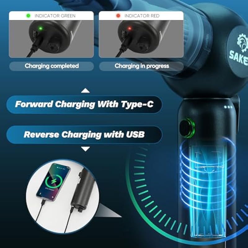 - 【6-in-1 Multifunctional Mini Vacuum Cleaner】 Saker mini vacuum cleaner integrates blowing, vacuuming, and inflating. You can not only use it to blow away dust from computer keyboards, cars, and other places, but also clean large areas of stains such as sofas and seats, or inflate lifebuoys or air cushions. The car vacuum cleaner also has certain in car safety protection functions, and the USB charging port output at the bottom can make it a convenient mobile power source.