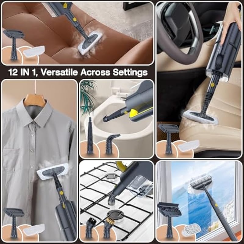 - 10-in-1 Multi-purpose Accessories and 350ml Water Tank: ScrubWiz steamer for cleaning equipped with 10 brush heads and 350ml water tank, steam mop not only simplifies floor and carpet cleaning tasks but can also be used for cleaning windows, bbq grill, clothing creases, gaps, stoves, sofas, and cars, providing a comprehensive cleaning experience