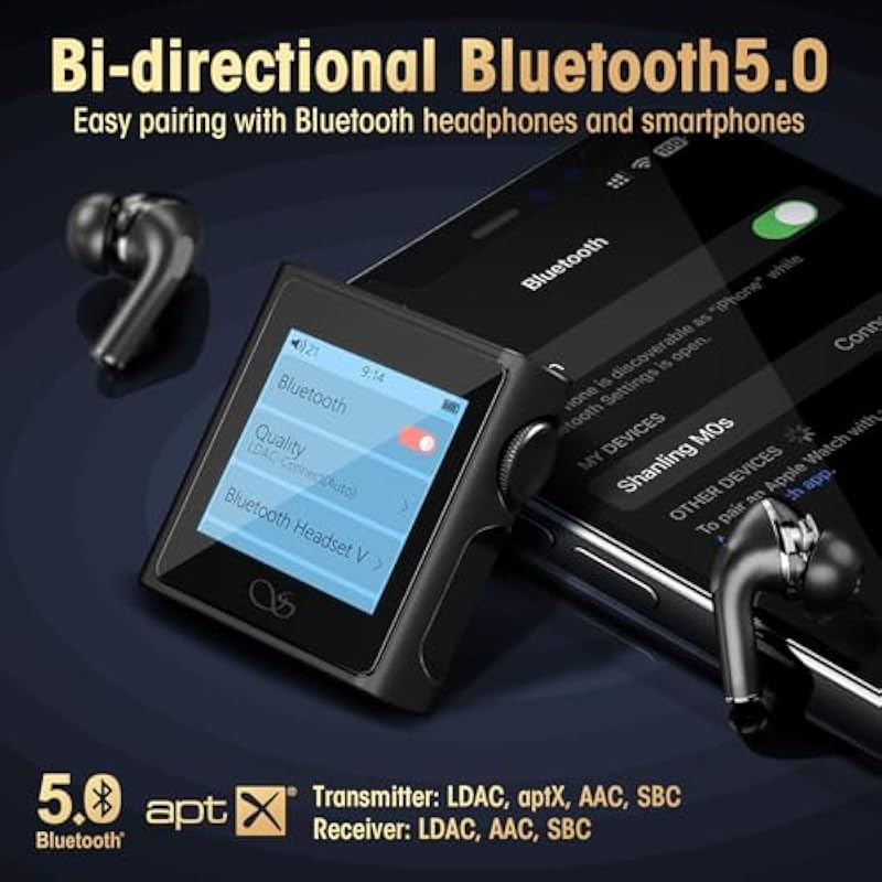 - MP3 Player with Bluetooth: This Bluetooth MP3 player features two-way Bluetooth 5.0 support for high-resolution wireless audio. It can be used as a transmitter to transmit signals or as a receiver to wirelessly amplify music.MP3 player supports sending: LDAC, aptX, AAC, SBC; receiving: LDAC, SBC, AAC
