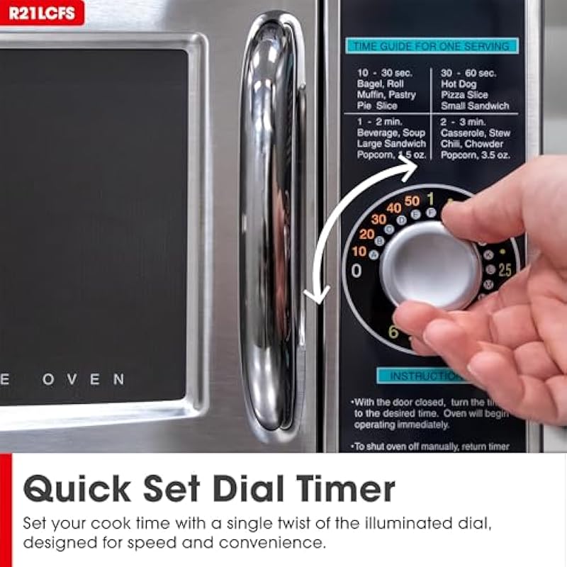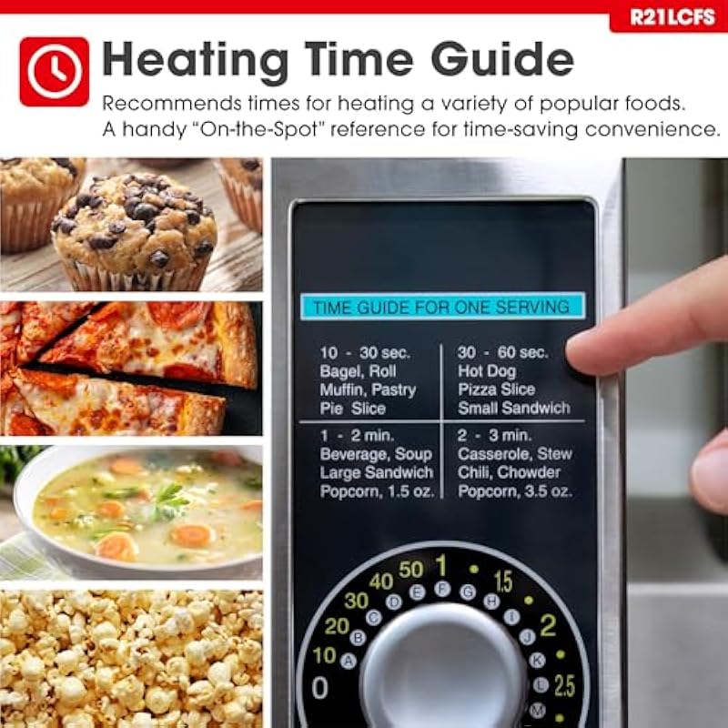 - HEATING TIME GUIDE: A handy “on-the-spot” reference for timesaving convenience is located above the timer with recommended times for heating a variety of popular foods.