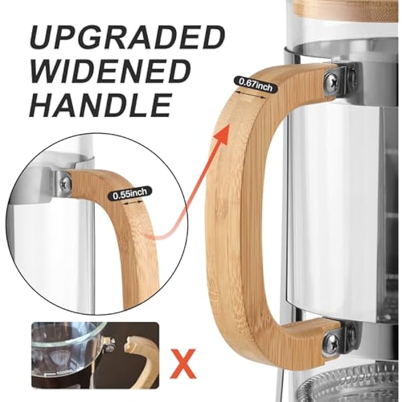 - Good Quality–The coffee stand is stable and liquids pour out easily and do not make a mess. The glass carafe is sturdy, and the filter screen is made of very fine mesh. The bamboo handle is comfortable to grip, the base and handle are plastic-free, more healthy !