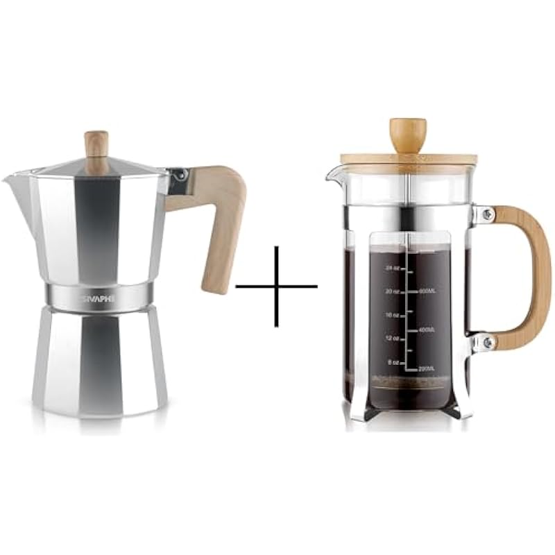 Sivaphe Aluminum Moka Pot Stovetop Espresso and Coffee Maker and French Press Coffee/Tea Maker with Bamboo Lid and Hand