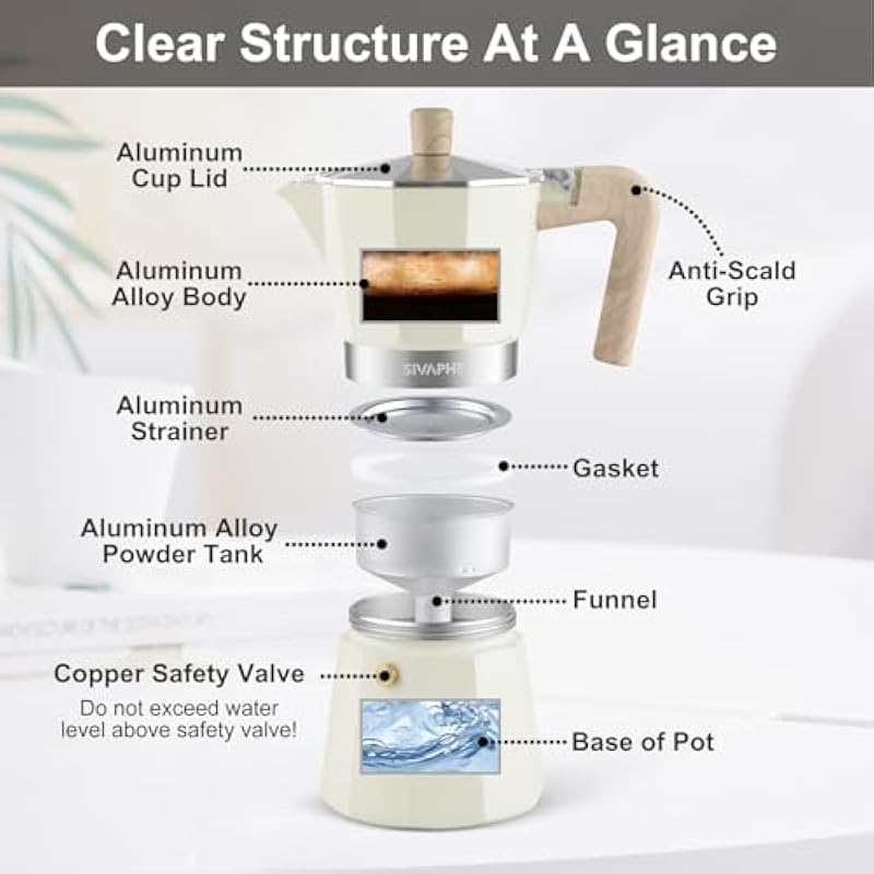- Sivaphe Aluminum Moka Pot 3 Espresso Cups, Percolator Espresso and Coffee Maker, Portable Stovetop Italian and Cuban Café Brewer for Home and Camping White