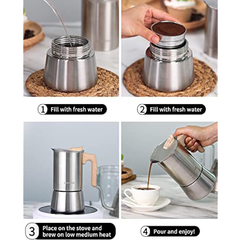 - FOR INDUCTION TO GAS OVEN–Our stove is made of particularly heat-resistant 430 stainless steel and is suitable for all types of stoves, whether induction(2cup mocha pot need little size induction cooker or a heated adapter), gas stove or camping stove.