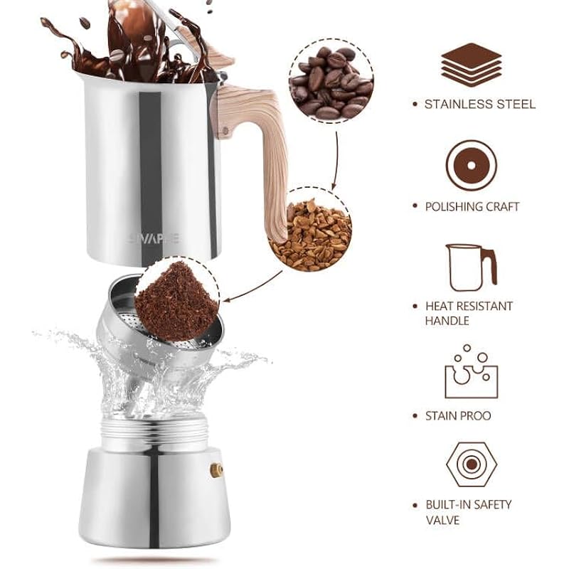 Sivaphe Stovetop Espresso Maker Stainless-Steel 3.5 oz, 1-2 Cup Coffee Maker Induction Moka Pot, 100ml Moka Campaing Coffee Pot, Induction Italian Mocha Pot with Step-by-step Instructions(1 Cup=50ml)