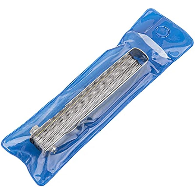 - Each feeler gauge is marked with both metric and imperial measurements.