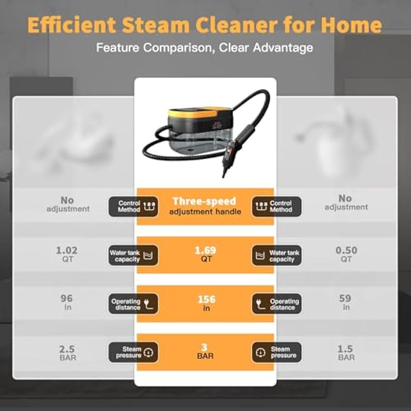 - Design: Steamer for Cleaning is equipped with a handle-mounted, three-level adjustable steam control function, ensuring precise output. Steam cleaner for home comes with a 1600ml water tank for extended use, reducing frequent refills. With a total stretching distance of 158 inches, this pressurized handheld steam cleaner can easily reach high or distant areas, making it suitable for tasks like bathroom steam cleaner for shower and steam cleaner walls floor and furniture
