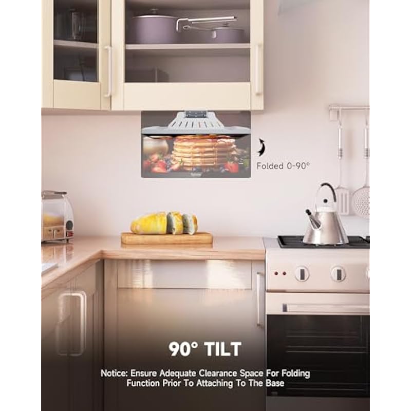 - 【Flap-Down Kitchen TV】Tailored for the kitchen, this Kitchen Flap Down TV folds vertically 90 degrees for easy installation under cabinets. The screen can rotate ±45 degrees horizontally, providing a variety of viewing angles.