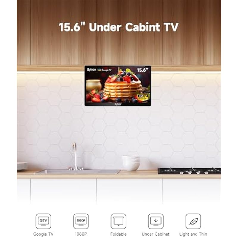 SYLVOX 15.6″ Kitchen TV, 1080P FHD Under Cabinet TV with App Store, Voice Assistant, Chromecast, 12-Volt for Small Spaces, Kitchen, Bedroom, RV – Fits Tight Cabinets