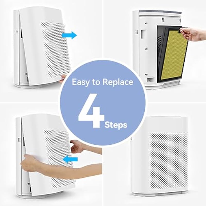 - [Easy to Replace] To replace the filter, proceed as follows: 1. Remove the front cover of the air purifier 2. Remove the used filter and replace it with a new one 3. Plug the two connectors at the top of the front panel into the main unit and press the center of the panel, it will make a very loud clicking sound. 4. Press and hold for 3 seconds to reset the filter indicator.