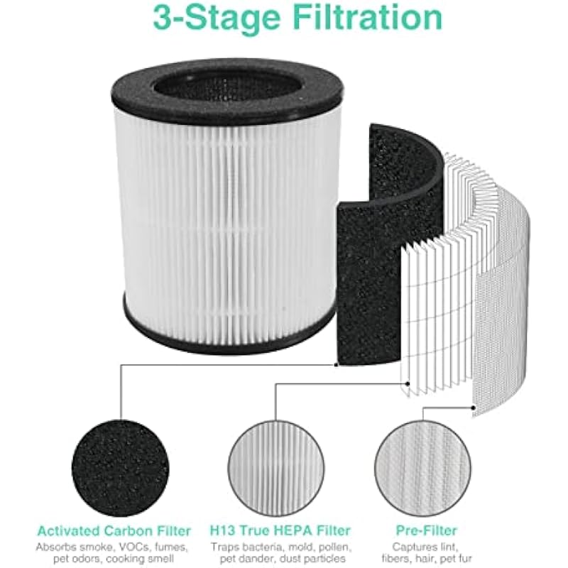 - [Better Air, Better Life] The replacement filter features 3 in 1 filtration System: Pre-filter, H13 true HEPA filter, and Charcoal filtration system work together to purify 99.97% of 0.3-micron particles from dust, pollen, PM 2.5, pet dander, smoke, cooking smell, hair and odor. Effectively improve indoor air quality and create a healthy environment.