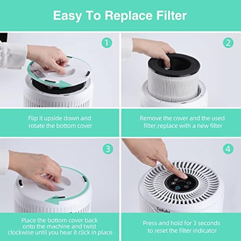 - [Easy to Replace] Simple to replace the filter as the steps below: 1. Flip the air purifier upside down and rotate the bottom cover 2. Remove the cover and the used filter, and replace them with a new filter 3. Place the bottom cover back onto the machine and twist it clockwise until you hear it click in place 4. Press and hold for 3 seconds to reset the filter indicator.