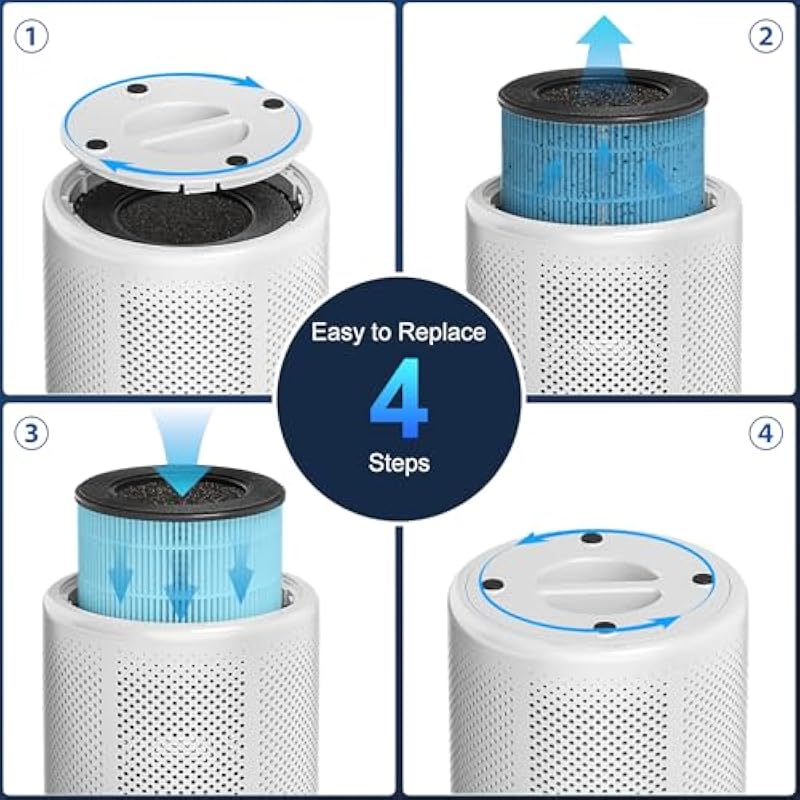 - [Easy to Replace] Simple to replace the filter as the steps below: 1. Flip the air purifier upside down and rotate the bottom cover 2. Remove the cover and the used filter, and replace them with a new filter 3. Place the bottom cover back onto the machine and twist it clockwise until you hear it click in place 4. Press and hold for 3 seconds to reset the filter indicator.
