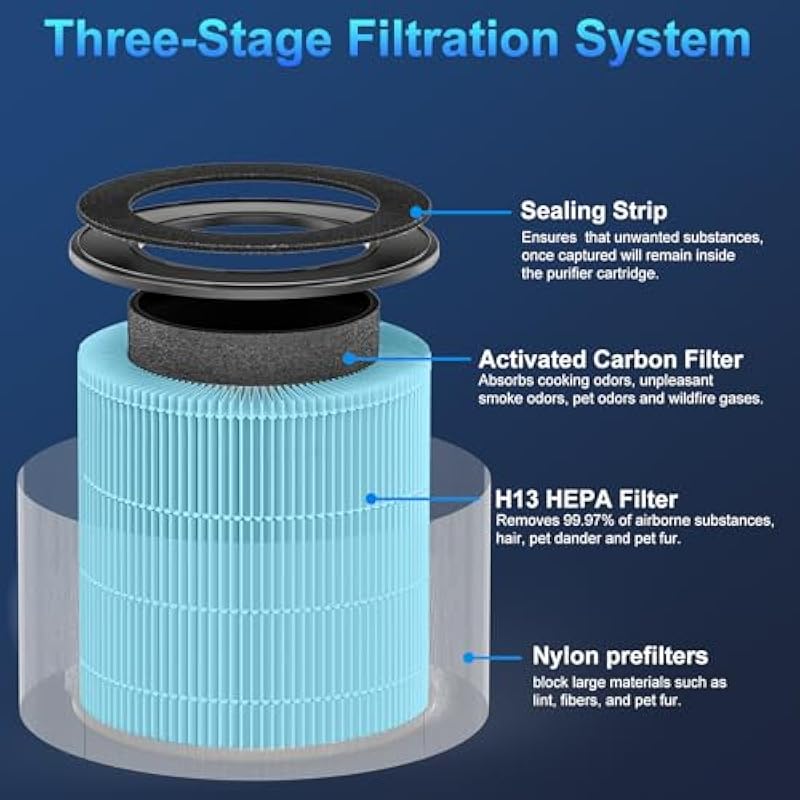 - [Better Air, Better Life] The replacement filter features 3 in 1 filtration System: Pre-filter, H13 true HEPA filter, and Charcoal filtration system work together to purify 99.97% of 0.3-micron particles from dust, pollen, PM 2.5, pet dander, smoke, cooking smell, hair and odor. Effectively improve indoor air quality and create a healthy environment.