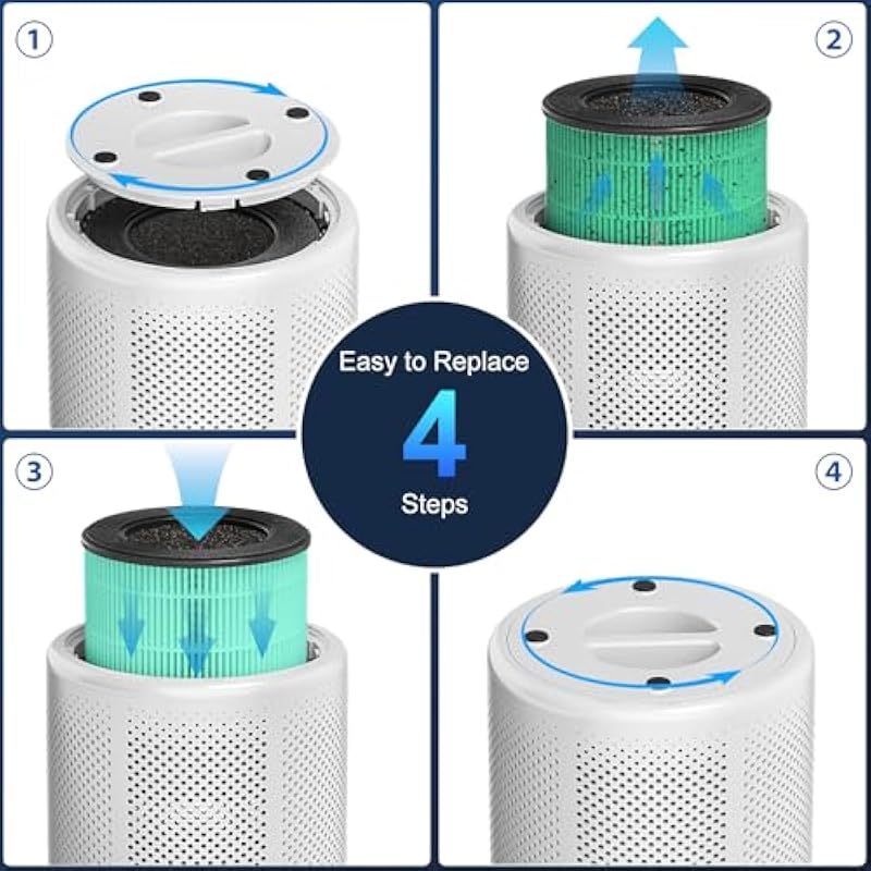 - [Easy to Replace] Simple to replace the filter as the steps below: 1. Flip the air purifier upside down and rotate the bottom cover 2. Remove the cover and the used filter, and replace them with a new filter 3. Place the bottom cover back onto the machine and twist it clockwise until you hear it click in place 4. Press and hold for 3 seconds to reset the filter indicator.