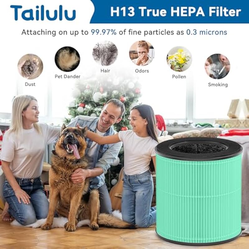 - [Better Air, Better Life] The replacement filter features 3 in 1 filtration System: Pre-filter, H13 true HEPA filter, and Charcoal filtration system work together to purify 99.99% of 0.3-micron particles from dust, pollen, PM 2.5, pet dander, smoke, cooking smell, hair and odor. Effectively improve indoor air quality and create a healthy environment.