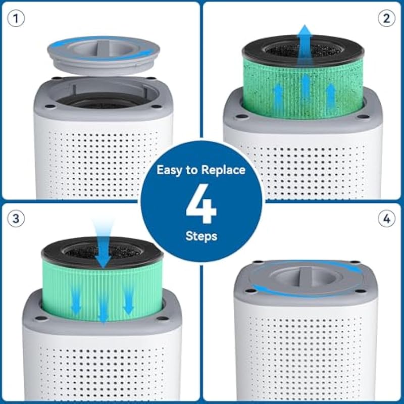 - [Easy to Replace] Simple to replace the filter as the steps below: 1. Flip the air purifier upside down and rotate the bottom cover 2. Remove the cover and the used filter, and replace them with a new filter 3. Place the bottom cover back onto the machine and twist it clockwise until you hear it click in place 4. Press and hold for 3 seconds to reset the filter indicator.