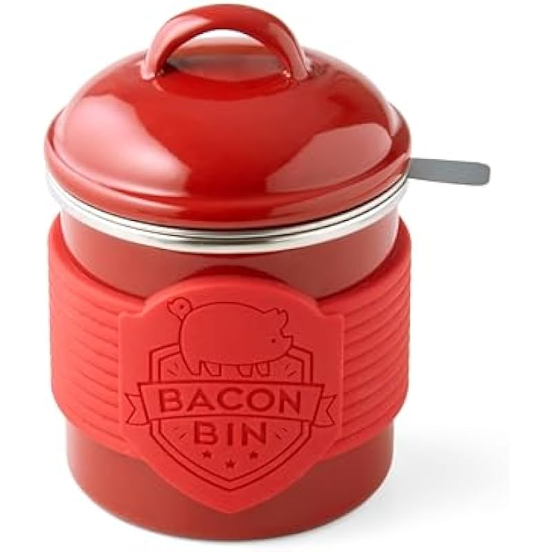 - Storage & Disposal: The metal bacon grease container allows you to easily store and dispose of bacon grease. The silicone sleeve insulates the Bacon Bin from the hot grease contents. Holds up to 16 oz.