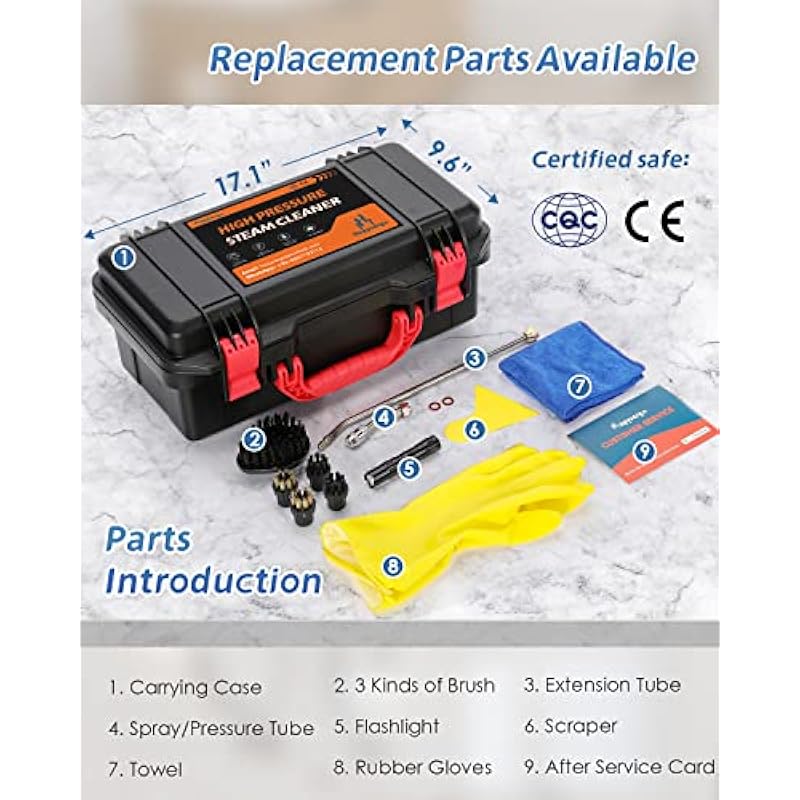 | Included Components | Nozzle, Cleaning Pad, Measuring Cup, Brass Brush, Squeegee, Nylon Brush, Hose, Mop Pad, Funnel, Extension Tube, Towel Sleeve, Plastic Brush, Grout Brush, User Manual |