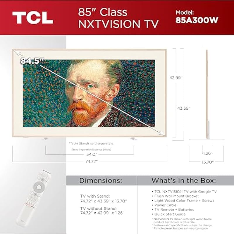 TCL 85 Inch Class NXTVISION Series Picture Frame Canvas Art TV | 85A300W, 2025 Model | QLED 4K HDR Smart Google TV | 120HZ Dolby Atmos Audio | Voice Remote Alexa Google Apple Streaming Television