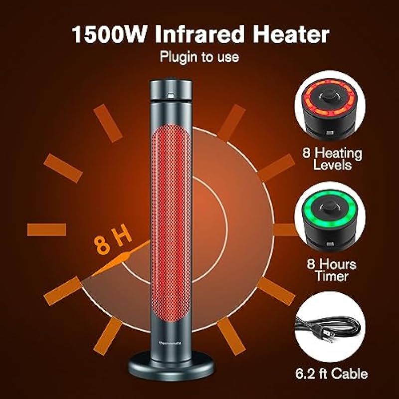 ThermoMate Electric Patio Heater, 1500W IP65 Outdoor/Indoor Infrared Heater with Remote, 8 Heating Levels 8-Hour Timer & Oscillation, Tip-over Protection for Garage Backyard Restaurant