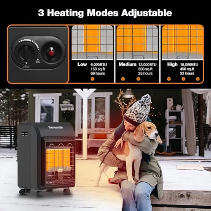 - 3 Heating Modes – 3 heating modes-6000/12000/18000 BTU propane radiant heater are optional to adjust the gas knob to choose the desired temperature.