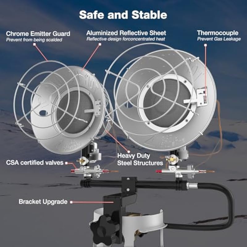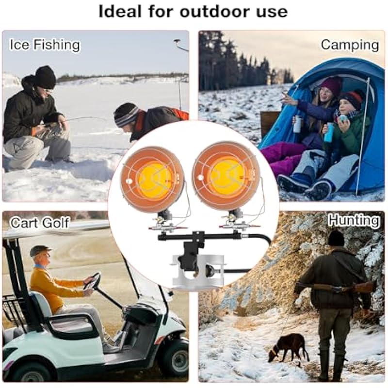 - Adjustable & High Output: 3 heating modes-15000/18000/30000BTU dual heads propane tank top heater are optional to adjust the gas knob to choose the desired temperature. Operates for up to 14 hours on a 20lb propane tank on high setting mode(30000 BTU), This portable propane heater outdoor can heat up the surrounding environment instantaneously, covering area up to 750 sq.ft