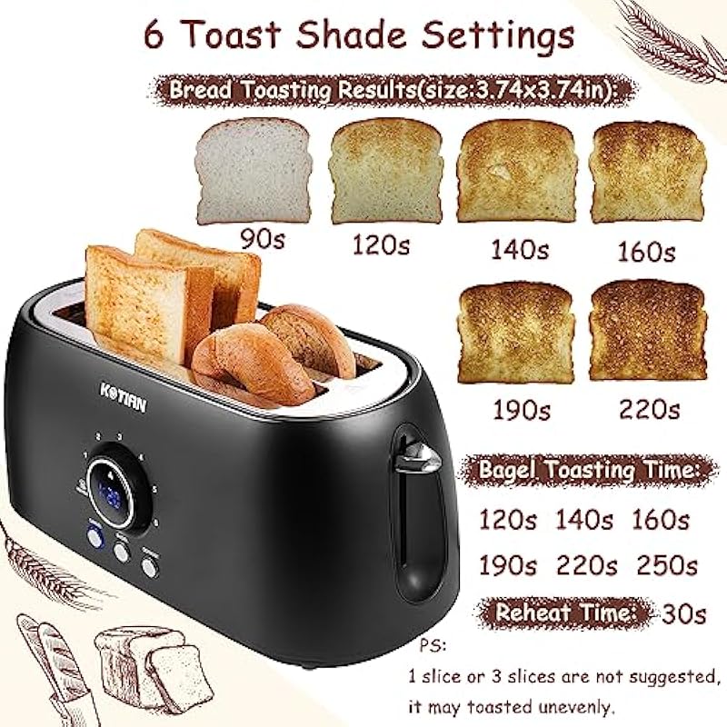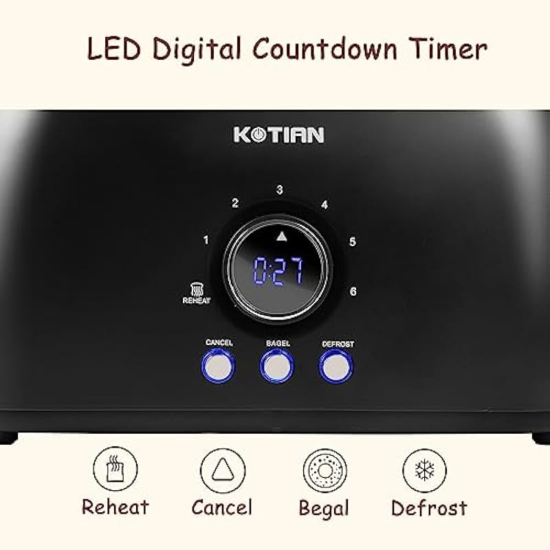 - Digital Countdown Timer: This 4-slice black toaster has a large LED timer display, which can accurately and clearly show you the remaining toasting time. Save your time to do other things, when the toast is finished, the toaster will pop up the lever to pop out the toast