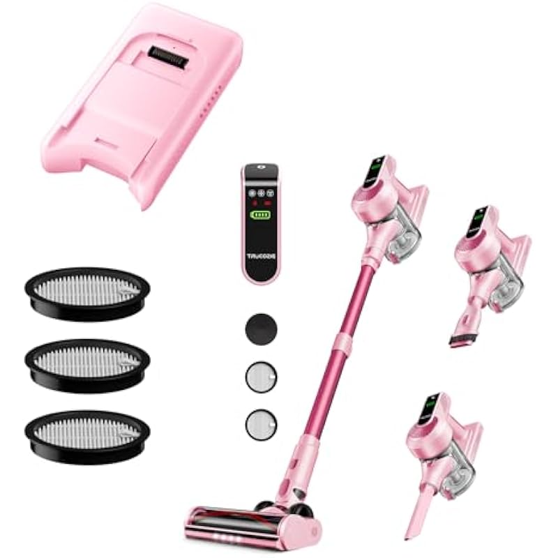 Trucozie Cordless Vacuum Cleaner T351 Pink, Self-Standing Lightweight Stick Vacuum with 45mins Runtime, Battery Pack Bundle and 3 Pack Hepa Filter Bundle