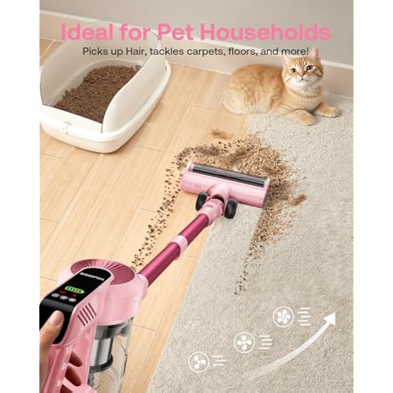 - 【De-tangle Larger Brush & LED Spotlight for Corners】Specially designed for pet owners, the larger floor brush is more anti-tangling and has stronger grip. This pet hair vacuum cleaner effectively cleans up pet hair and is ideal for keeping your home clean and tidy. The LED front spotlight illuminates even the darkest corners, allowing you to easily spot and remove dust. Clean under beds and sofas with ease and ensure no dust is left hidden