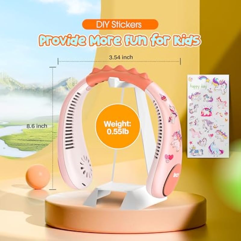 - ✨【Neck Fan for Kids & Unicorn DIY Sticker】The cute fan is specially designed for kids, safe, compact and lightweight. Kids fan comes with a unicorn sticker, children can DIY their own fans. Both fun and practical. Enjoy coolness with hands free, and also can reduce the possibility of kids losing fan.