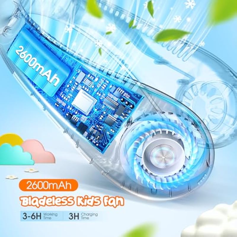 - ✨【Comfortable & Safe】Kids portable fan is made of food-grade silicone and groove design, soft and breathable, avoiding getting prickly heat. Also, bladeless neck fan avoid injuries and hair tangles.