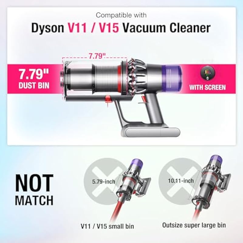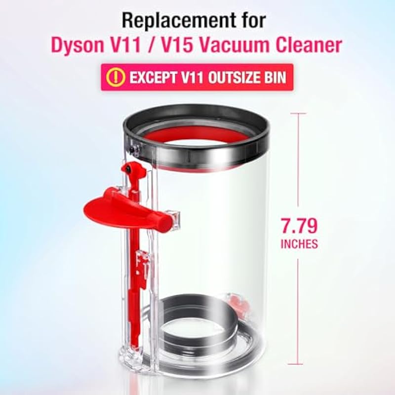 - Wide Compatibility: Our dust bin replacement is compatible with Dyson V11 V15 SV14 SV15 SV22 models, with a height of approximately 7.79 inches and a diameter of 4.45 inches. (Please note: Not compatible with V11 Small Bin and V11 Outsize Bin models).
